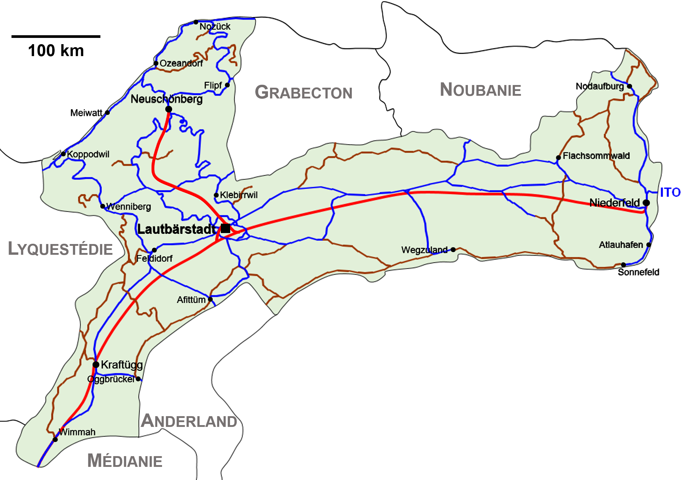 * Rouge : Schnellfahrstrecken (lignes à grande vitesse) * Bleu : Lignes classiques électrifiées * Brun : Lignes classiques non électrifiées